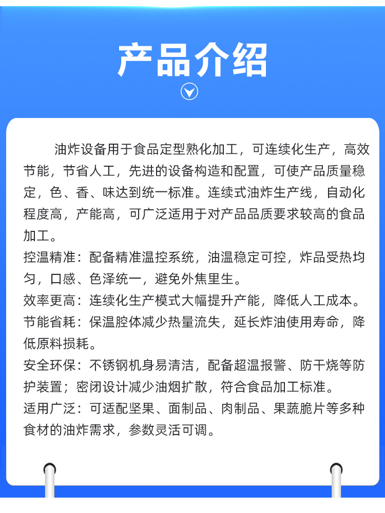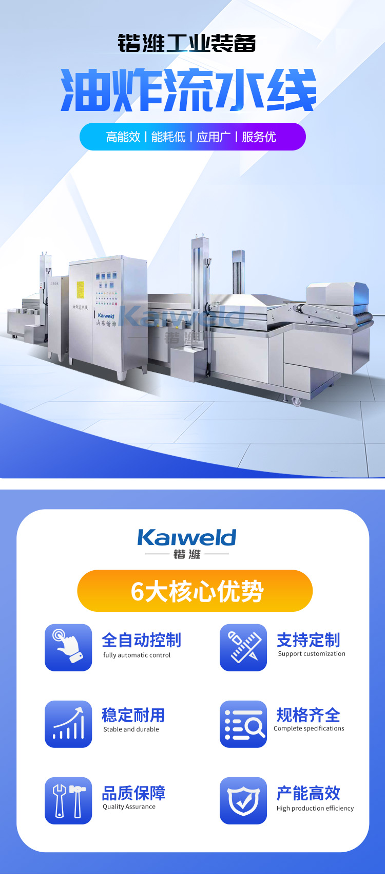 专为食品工业化批量生产设计的连续式、自动化高温油炸加工成套设备,区别于商用小型油炸锅,它可实现物料连续进料、自动输送、控温油炸、沥油、冷却、出料的全流程一体化作业,广泛应用于休闲食品、速冻调理品、肉制品、豆制品、面制品等规模化食品加工领域。